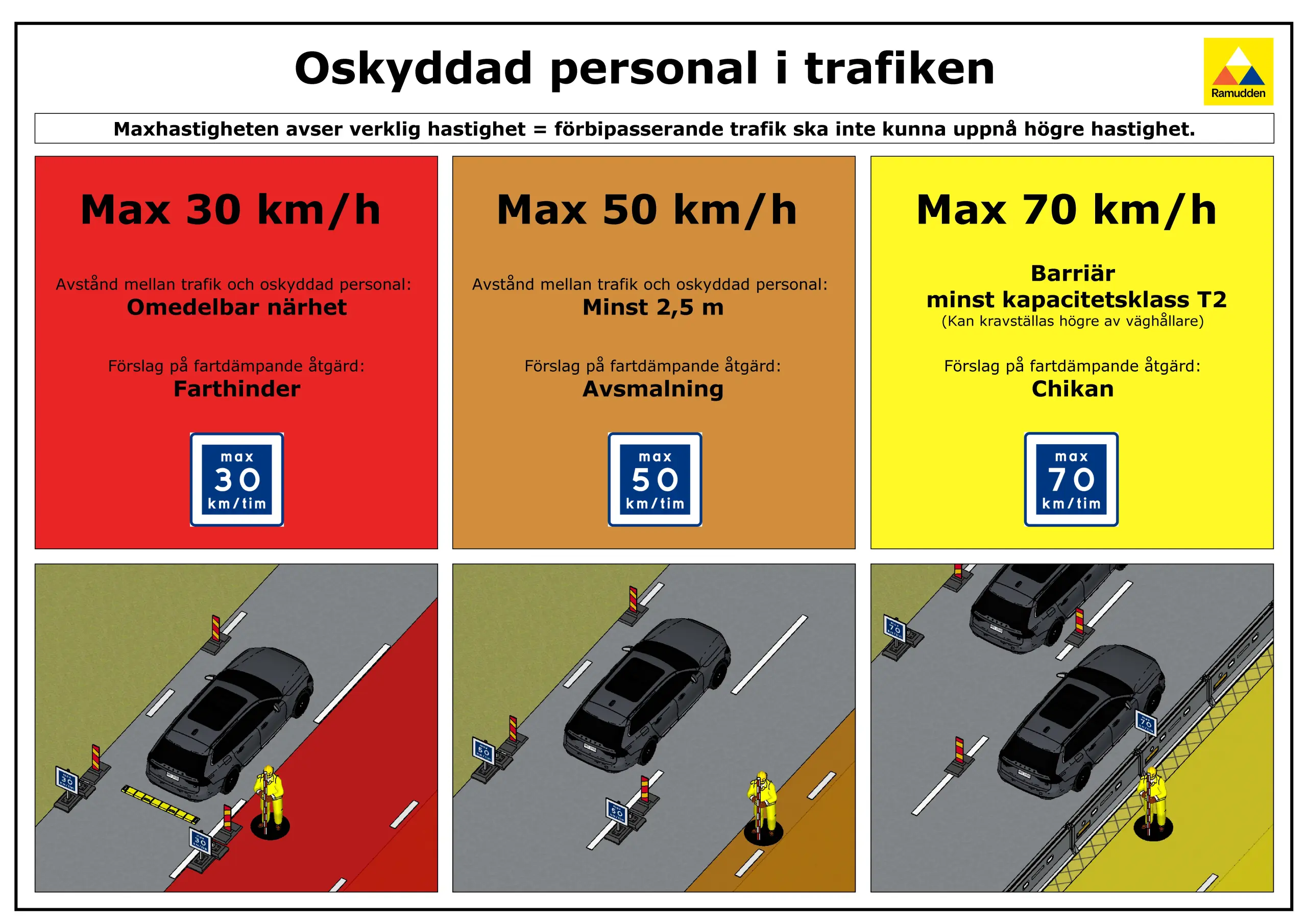 Olyckor blir lindrigare om vi kan dämpa farten, därav är det viktigt att vi ser till att det inte går att uppnå en högre hastighet än vad som är kravställt. För dig som arbetar ute på vägen är det här en av de viktigaste åtgärder vi kan göra för att undvika svåra olyckor.