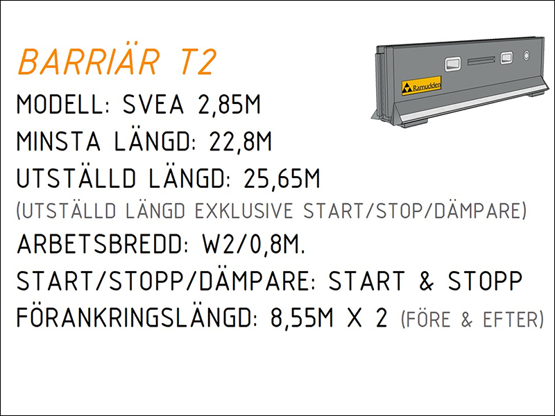 Arbetsbredd: W2 / 0,8 m. Visar hur långt barriären glider vid påkörning, detta enligt tillåtelsebeslut från Trafikverket.
